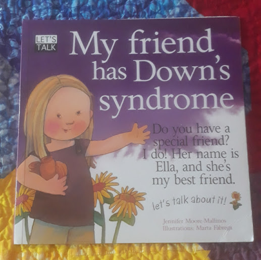 [Image Description: The book called "My Friend Has Down Syndrome" written by Jennifer Moore-Mallinos and illustrated by Marta Fabrega laying on a red, yellow, blue, and purple quilt. There is a square logo that says "LET'S TALK" in a square in the top left corner of the book cover. "LET'S" is in a white rectangle and "TALK" is in a black rectangle under "LET'S." "My friend has Down Syndrome" is in white text with "My friend" in left-aligned text and "has Down Syndrome" in right-aligned text to the left of the "LET'S TALK" logo. "Do you have a special friend? I do! Her name is Ella, and she's my best friend." is in center-aligned black text under "syndrome on the right center of the book. "let's talk about it!" in center-aligned curved black text under "my best friend." There is a sun flower with yellow petals, an orange center, and 3 green leaves at its bottom on the right side of "let's talk about it!". "Jennifer Moore-Mallinos Illustrations: Marta Fabrega" is in left-aligned purple text under "let's talk about it!". In the bottom left corner of the book cover, there is a picture of a girl with Down Syndrome named Ella who is smiling and wearing her long straight blonde hair down in a middle part along with a short sleeved dark purple shirt and gray shorts. Ella has her left hand spread out in front of her and is holding three small light brown pottery creations. There is one big sun flower with yellow petals, an orange center, and two green leaves behind Ella to the left and two big sun flowers with 2 leaves of all of the same colors behind Ella to the right. The top to the middle of the book cover is dark purple and the middle to the bottom of the book cover is white.]My Friend Has Down Syndrome is about a group of campers who find out from their camp counselor named Miss Theresa that a little girl with Down Syndrome named Ella will be joining their group. The main character is very excited when Miss Theresa asks them to be Ella's welcome buddy to show her the ropes. However, the campers also worry about Ella attending the camp such as being concerned that they will catch her condition and insisting the possibility that she should attend a "special camp." So, Miss Theresa educates them about Down Syndrome and inclusion.